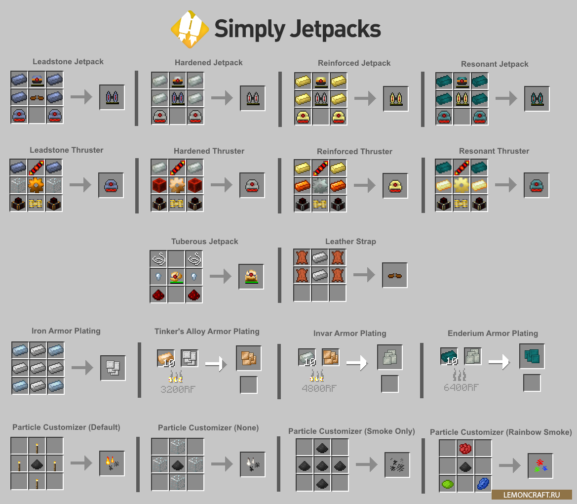 Мод Simply Jetpacks 2 является аддоном для мода Ender IO. Это дополнение добавит в игру реактивные ранцы, с которыми вы сможете летать по вашему миру. Аддон добавляет разные виды реактивных ранцев, которые будут отличаться друг от друга своими характеристиками. Так же ранец будет работать в разных режимах: аварийная посадка, поддержания высоты, выключен.